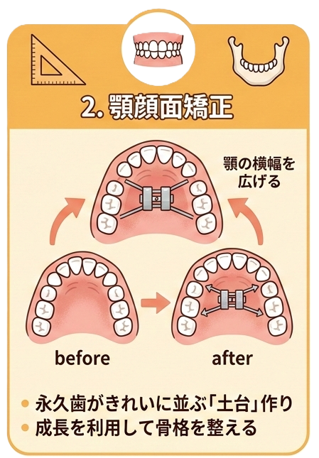 顎の横幅を広げ、永久歯がきれいに並ぶための「土台」をしっかり作ります。