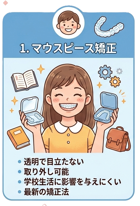 透明で目立たず、取り外しも可能。学校生活に影響を与えにくい最新の矯正法です。